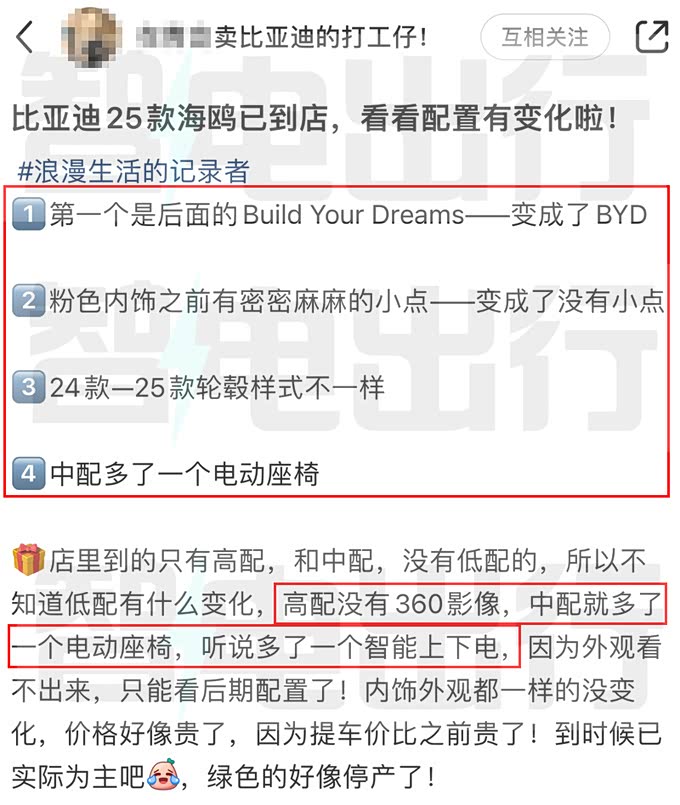 2025款海鸥尾标由“BUILD YOUR DREAMS”缩减为“BYD”,粉色内饰取消点状元素装饰,轮毂进行了升级,中配车型升级电动座椅。新车或将继续搭载单电机,最大功率55kW,最大扭矩135N·m,提供305km与405km两种续航版本。
