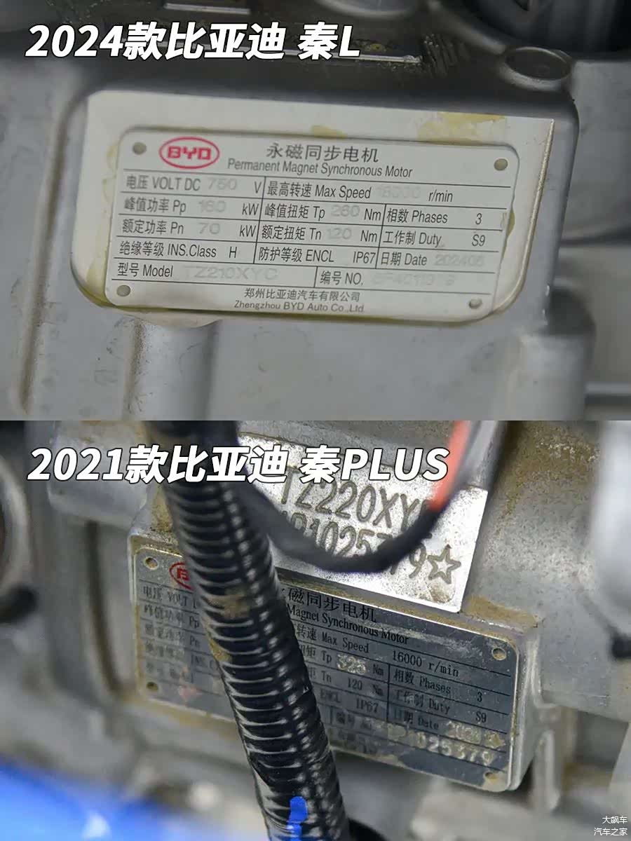 从电机铭牌上能看出,这辆秦L也是永磁同步电机,不过,相比秦PLUS电机工作电压从550V提升到750V,峰值功率提升到160千瓦(秦PLUS为145千瓦),额定功率都是70千瓦。也就是说,秦L的电机电压高,电流小,能耗也就更低,尽管电机的扭矩小了不少,但确实省电了。