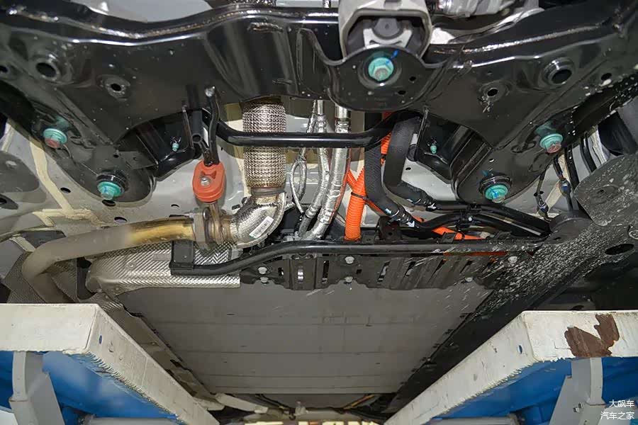 排气管从前到后,隔热措施不多,电池部分有比较完整的隔热。