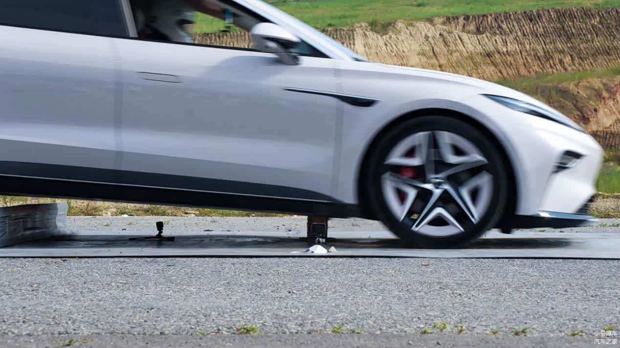 第三项测试是巨石阵测试,模拟的是我们远途游玩或者途经施工路段的糟糕路况,石头崩起会给底盘造成毁灭性的伤害,这项测试一般都是面向轻越野级SUV的,用轿车进行测试同样是自信的体现。长度200米/宽度5米的测试车道摆放着多个大小不一的不规则石块,石块高度普遍都在13cm以上,最高能达到22cm,测试车辆以不低于50km/h的速度通过,底盘被石块不断撞击,危险程度是非常高的,但测试过后,飞凡F7的电池组同样没有出问题,高压线束和电子元件也没有出现破损、起火。