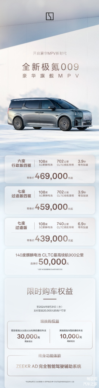 2024年8月31日 24:00(含)前支付定金2万元的用户,可享受限时购车权益:2024年7月19日 21:00(含)前,完成交付的极氪009新车首任车主,或完成锁单的极氪009 光辉新车首任车主,购买首台全新极氪009可享受3万元购车尾款抵扣;2024年7月19日 21:00(含)前完成交付的极氪001、极氪001 FR、极氪007与极氪X 车型的新车首任车主,购买首台全新极氪009可享受1万元购车尾款抵扣;可享受全新极氪 009免费升级ZEEKR AD完全智能驾驶辅助系统终身功能体验。