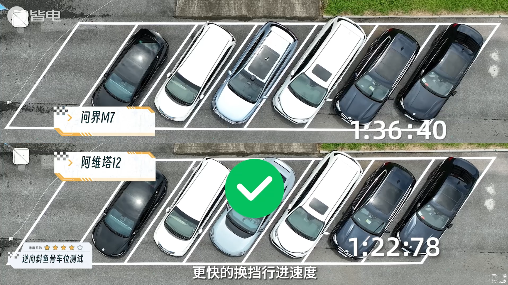 逆向斜鱼骨车位挑战环节难度倍增。在这个项目上,华为系的问界M7和阿维塔12均成功入库,但是揉库的次数较多,看上去没有那么完美。而腾势N7的表现及其惊艳,整个过程非常稳健且用时最短,展现了强大的智驾能力。小鹏G6和知己LS6挑战失败,无法完成识别泊入。