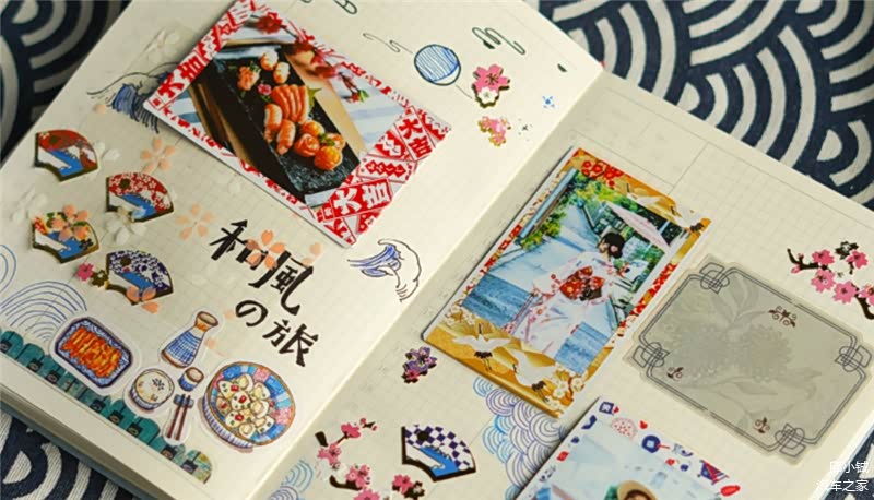 我手边的这份包括贴纸、御守、迷你相册的周边礼品,就来自富士INSTAX拍立得,这套相纸主题为和风十景,相纸边框装饰以浮世绘、相扑、招财猫、千纸鹤、日本料理、祭典、忍者、御神符等元素,十分有趣。