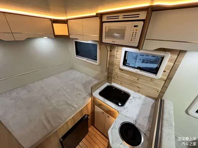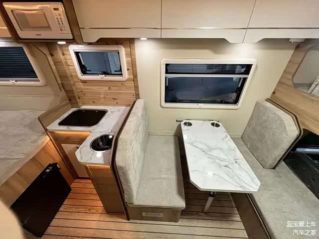 厨房区紧邻车门,一体式大理石台面宽敞,集成了多功能水槽、水龙头和电磁炉,周围储物柜设计精妙,方便存放厨具和食材,让烹饪变得简单便捷。