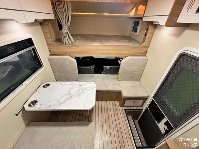 会客区设计为社交核心,配备四人对向座沙发和可调节高低的升降桌,无论是家庭出游还是朋友聚会,都能找到舒适的角落。沙发座垫柔软,升降桌巧妙可调节,可根据需要变换高度,甚至可转化为沙发床。侧壁设有推拉窗,保障了充足的光照和通风,使得旅途中的每一刻都充满阳光和新鲜空气。