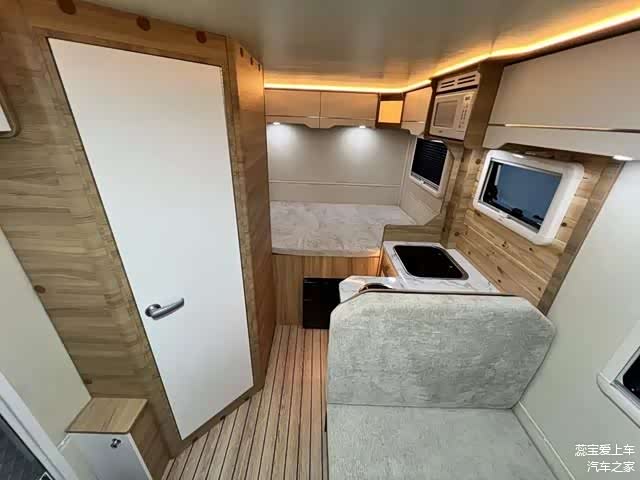 内部设计以暖色调为主,配以大量木质家具,创造出一个温馨而舒适的家庭氛围。内部使用了E0级环保板材和专用地板,确保环境的安全与健康,使每位乘客都能享受健康的旅行环境。车内空间布局明晰,包括会客区、厨房、卫生间及休息区,不仅满足了多种使用需求,也有效利用了每一寸空间。