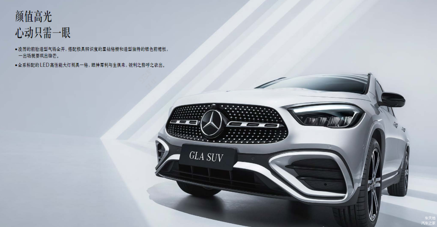 新款奔驰GLA在前脸造型上进行了精心的调整,采用与GLC相似的星钻格栅设计,这一改变赋予了前脸更加时尚且具有辨识度的外观。