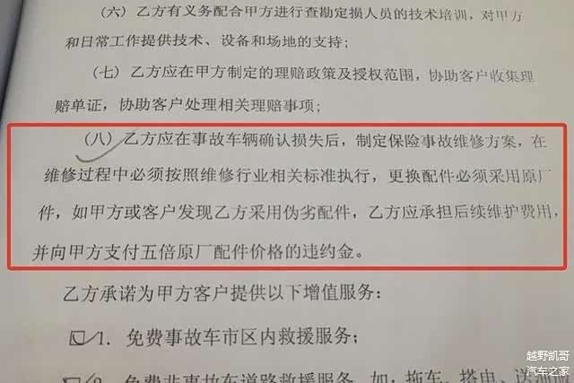 该负责人向记者提供的一份与郑州汇升奔驰4s店签订的《保险事故车辆维修合同》,也证实了其说法。双方协议第三项第8条提到:乙方(汇升4s店)应在事故车辆确认损失后,制定保险事故维修方案,在维修过程中必须按照维修行业相关标准执行,更换配件必须采用原厂件,如甲方或客户发现乙方采用伪劣配件,乙方应承担后续维护费用,并向甲方支付5倍原厂配件价格的违约金。