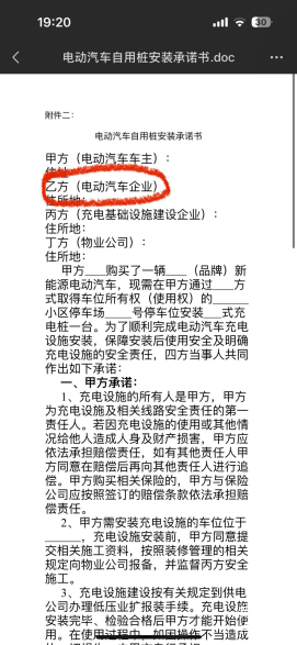 第三,签订承诺书:充电桩安装承诺书,也可称为充电设施安全管理协议。一般由业主、充电桩销售方、充电桩施工企业签订,也可以成为三方协议或四方协议(算上物业)。(如果充电桩安装条件都符合,物业阻扰不同意盖章,可以12345等渠道反馈。)
