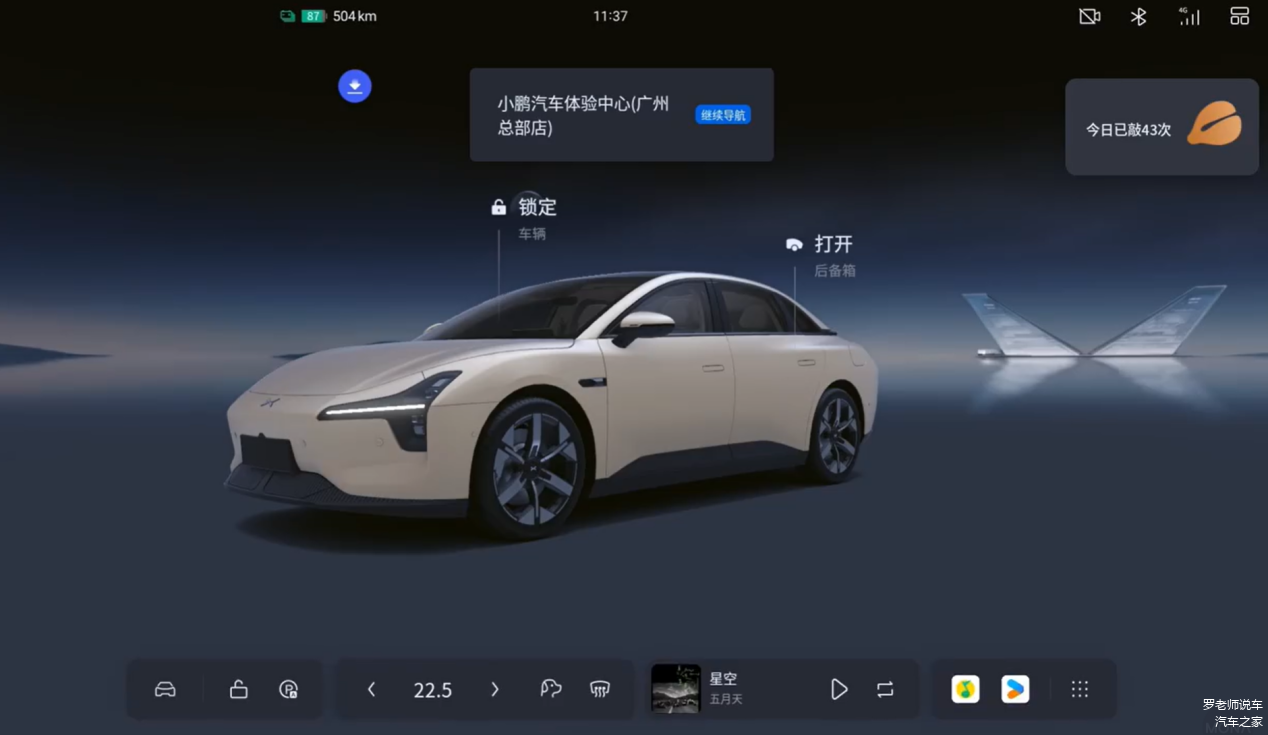 小鹏MONA M03车机系统的主界面为车辆3D页面,页面的中上部分为车辆的3D建模,并且在下方DOCK栏处还能对音乐、空调以及车辆进行快捷控制。