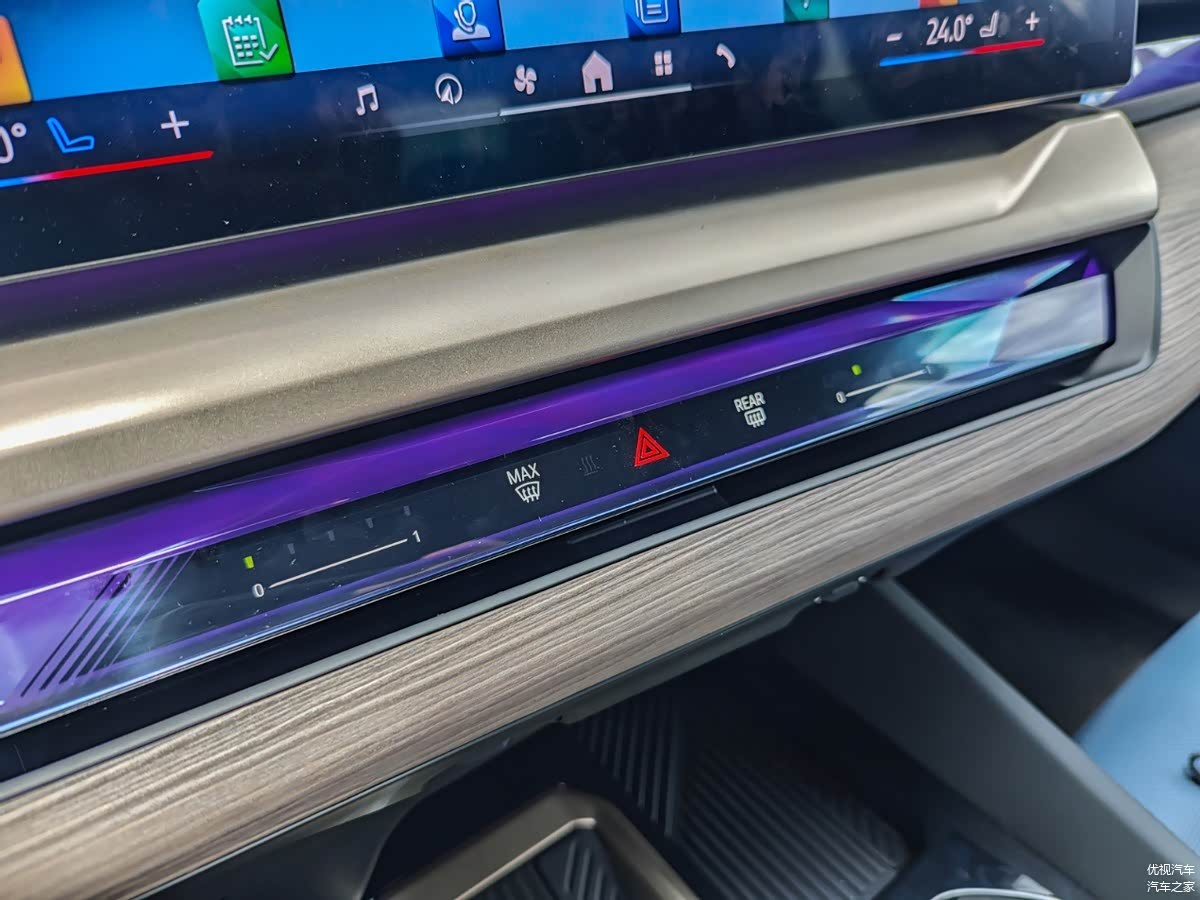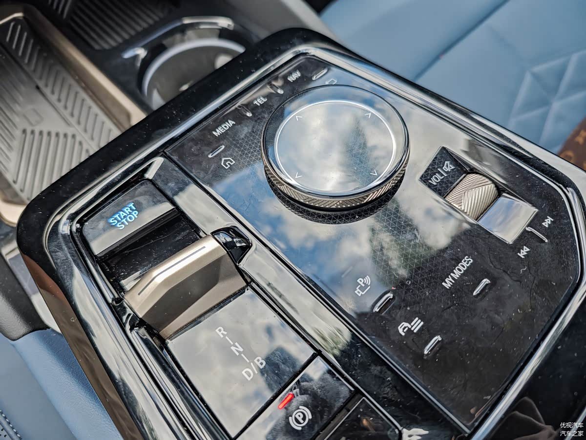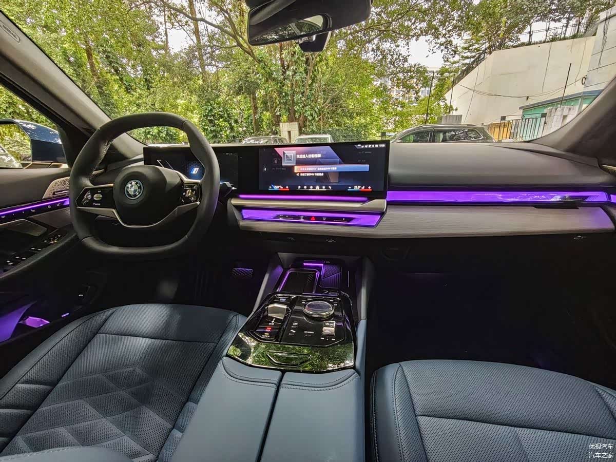 创新纯电动BMW i5取消了传统的堆叠式物理按键中控台设计,大部分物理按键消失,用一块由12.3英寸液晶仪表与14.9英寸中央触控屏组成的一体悬浮曲面屏取而代之,中控和门板区域辅以流金饰板。虽然没有了熟悉的“大鸡腿”电子档杆,但水晶换挡杆、水晶iDrive旋钮也都彰显着豪华品牌的身份。