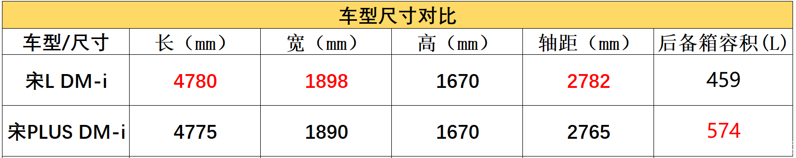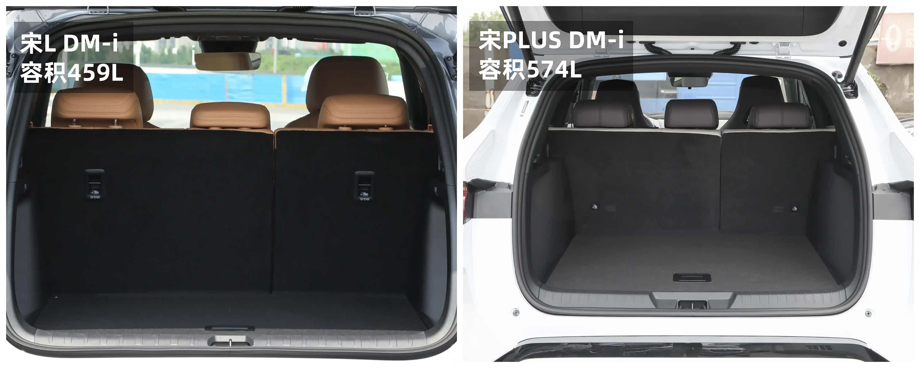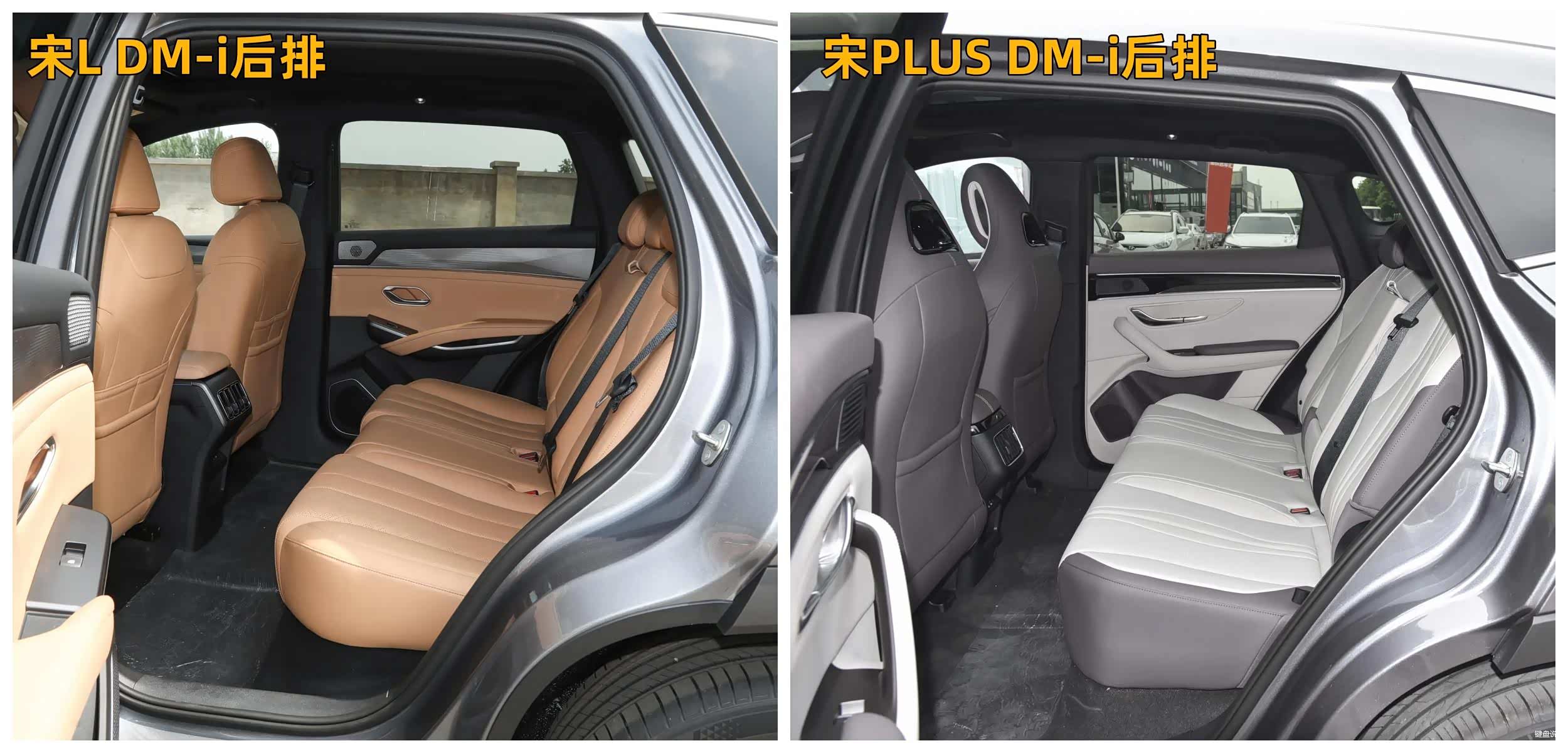 从尺寸上来看,宋L DM和宋PLUS DM-i三围尺寸基本一致,但宋L DM定位中型SUV,宋PLUS DM则是定位紧凑级SUV,从比亚迪厂家的视角上看,这可以让两车排在不同的细分销量排行榜中,避免直接竞争,其次两车在乘坐空间上确实有明显的差别,宋L DM的后排腿部空间要大很多,而宋PLUS DM的后备箱空间则要更胜一筹。
