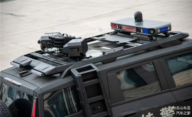 猛士917防弹特警版,车顶按照报警灯之后,再加上该车车身宽度超2米,高度也超2米,虽然车身只有4987mm的长度,但这款车依然具备十足的压迫感。