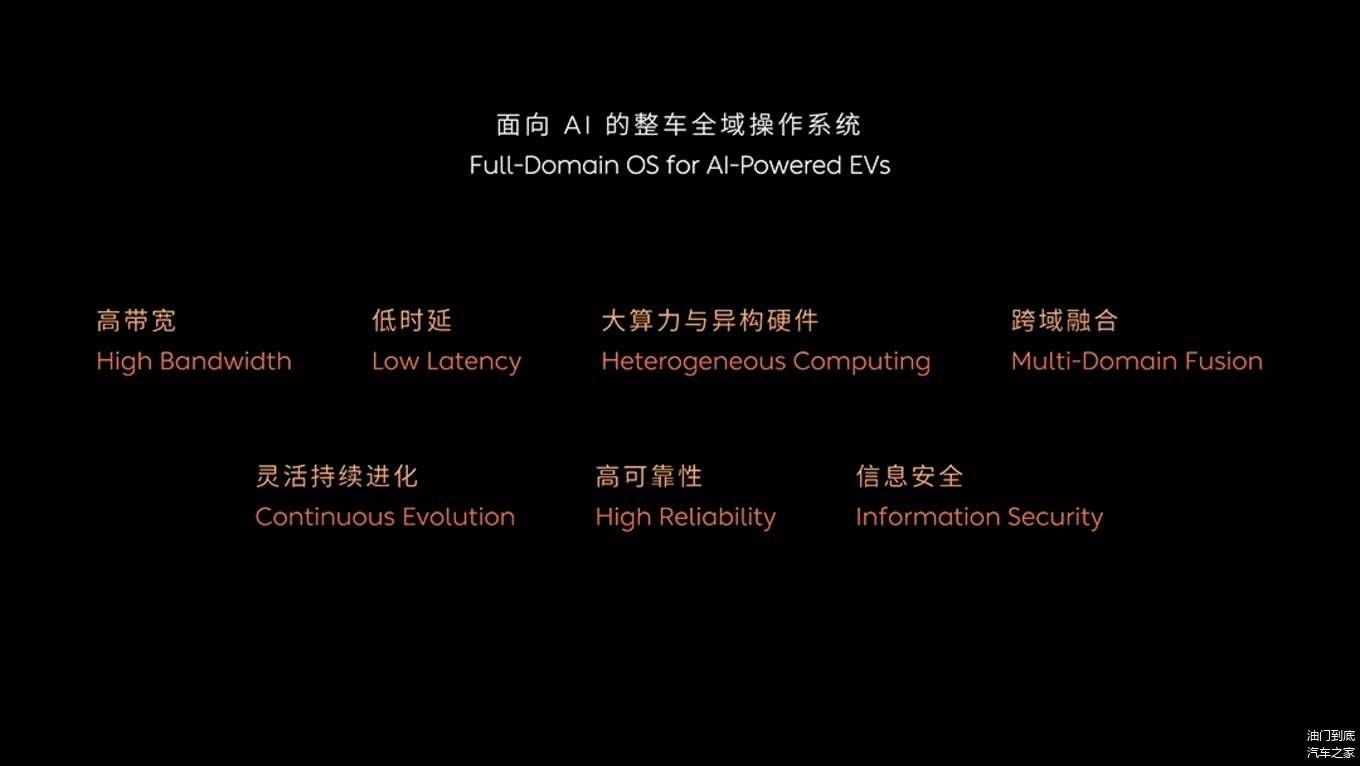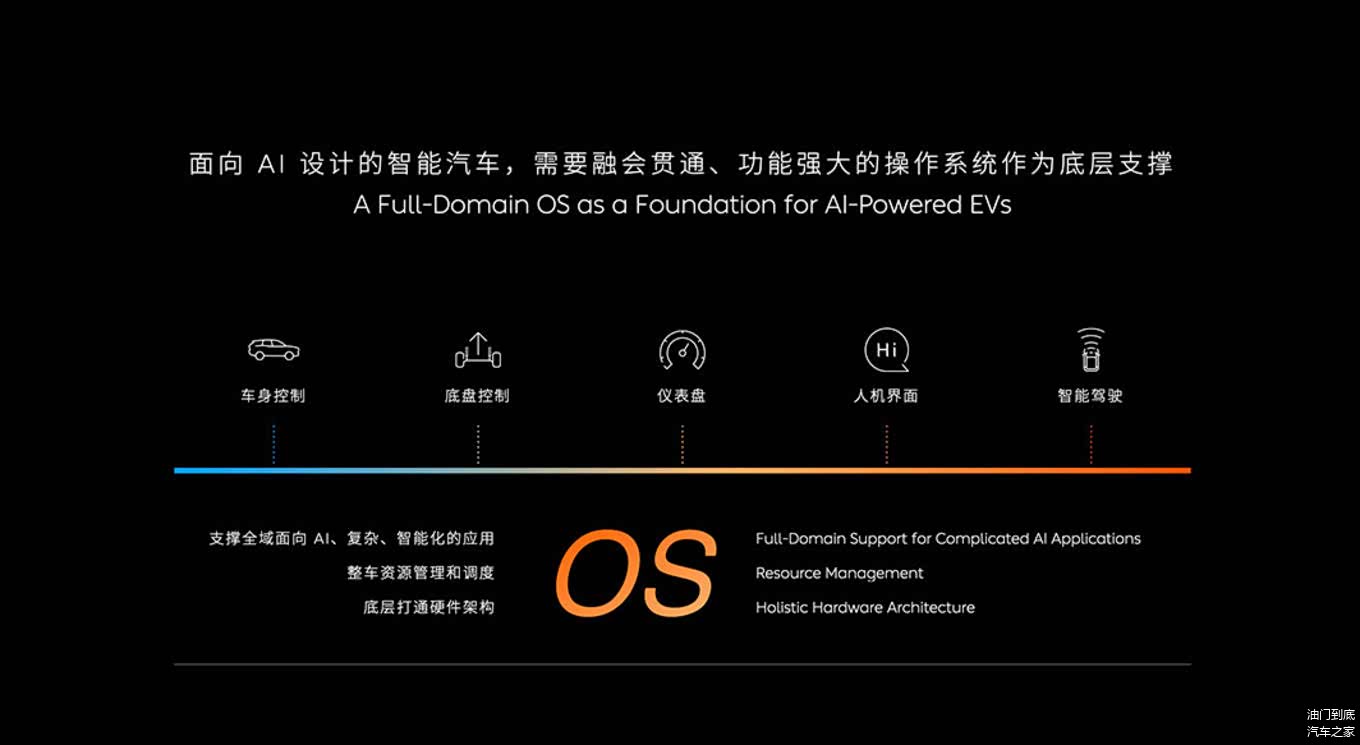 该系统主要通过在底层打通智能硬件、计算平台、通信与能源系统,实现对车联、车控、智能驾驶、数字座舱、手机应用等全域应用的统一管理与协调。