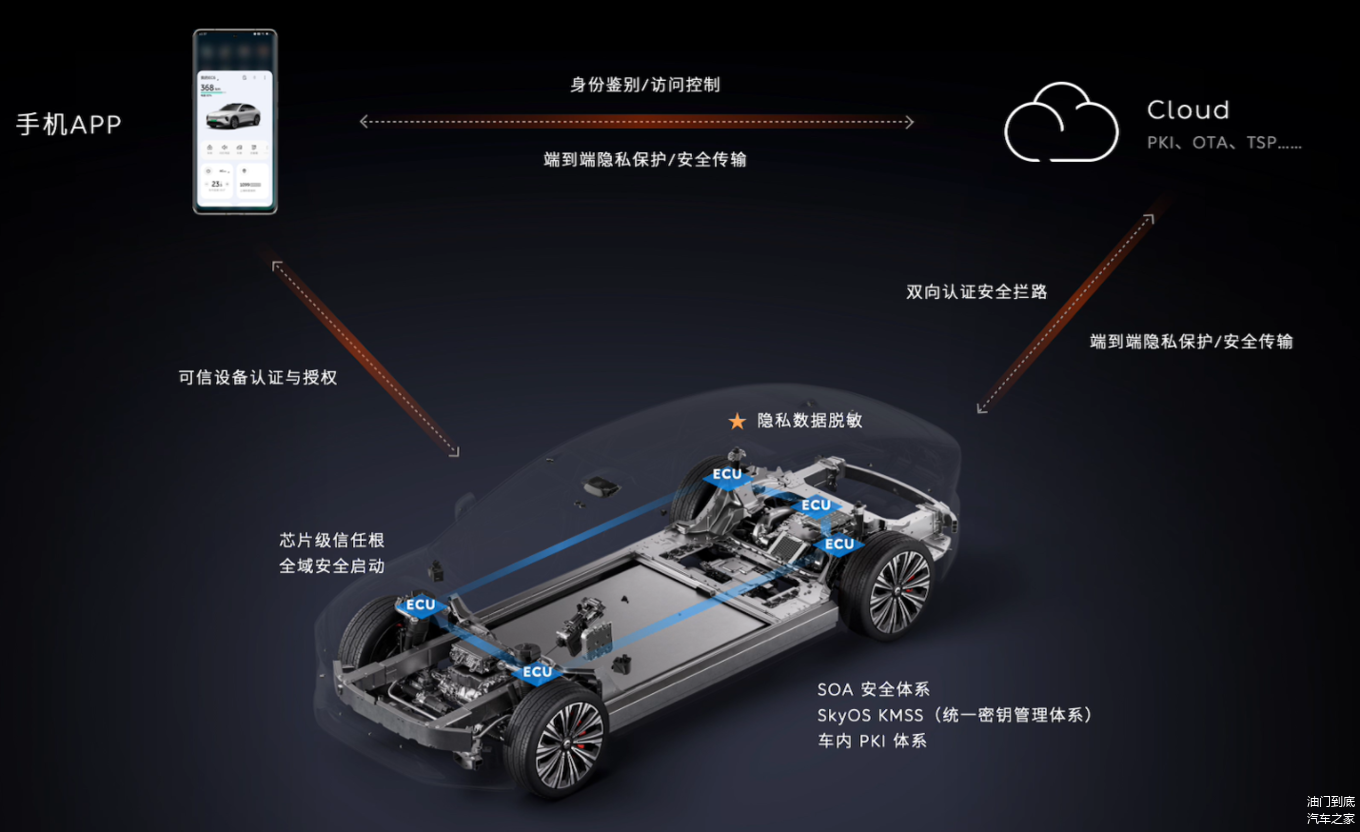 在数据隐私保护方面,SkyOS·天枢收集数据都进行脱敏处理,数据传输在端到端的加密信道,并且行业首次实现单车PKI系统,每辆车都有独立的证书发放系统。