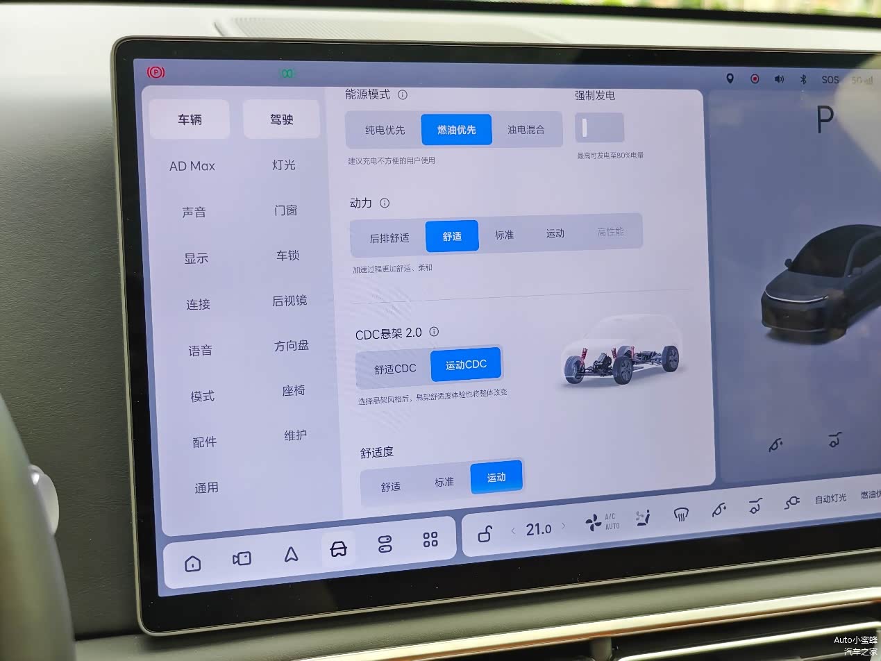 相比起L7/8/9,L6的灵活性明显更好,在舒适模式下,车头指向表现并不积极,减震器的阻尼也相对较软,有略微“船”感。而使用运动CDC+运动悬架的组合之后,整体会紧绷不少,更适合一人驾车出行。