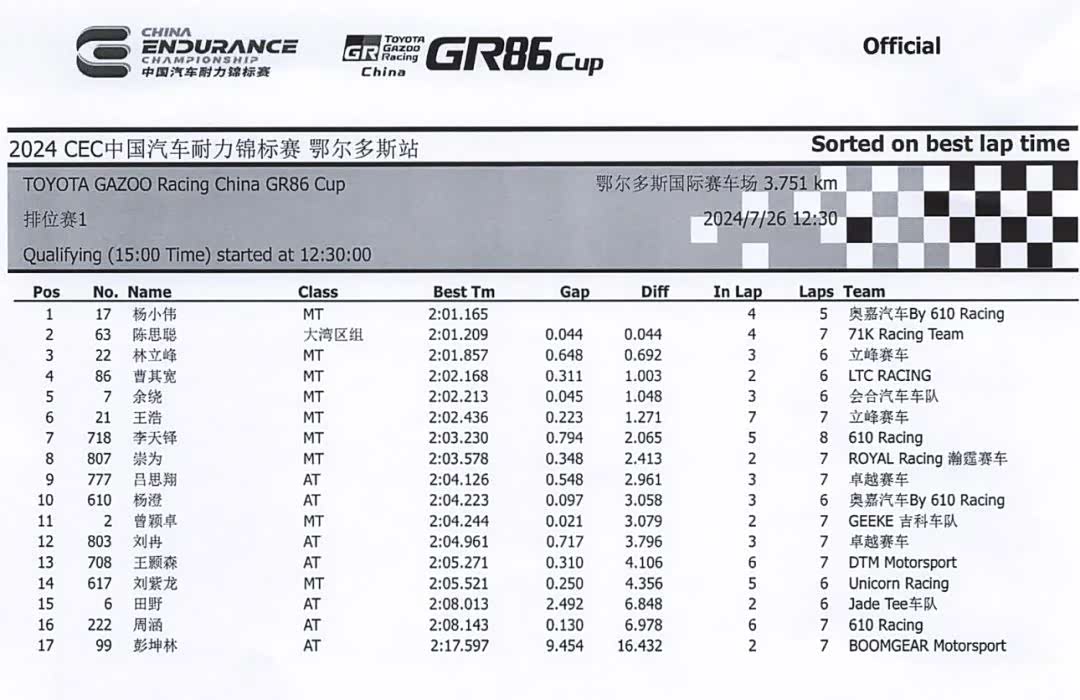 7月26日,2024 TOYOTA GAZOO Racing China GR86 Cup鄂尔多斯揭幕战迎来排位赛的对决。来自全国各地的赛车精英在鄂尔多斯国际赛车场全力冲刺,为赛事的历史首杆展开激烈竞逐。奥嘉汽车By 610 Racing的杨小伟在激战中突围而出,斩获两节排位赛的杆位。