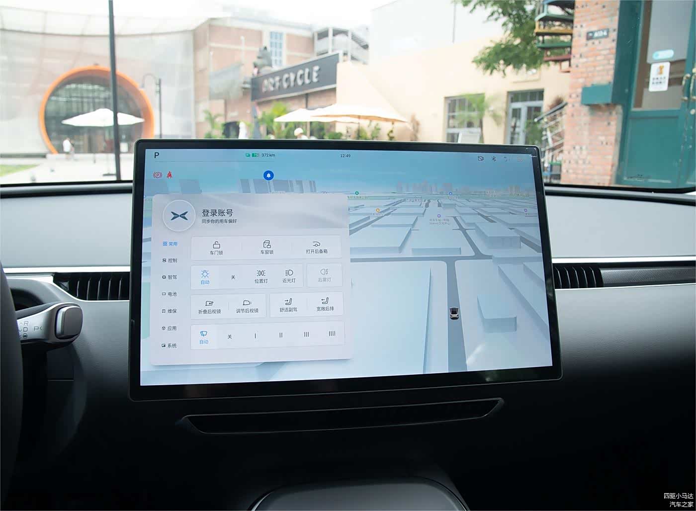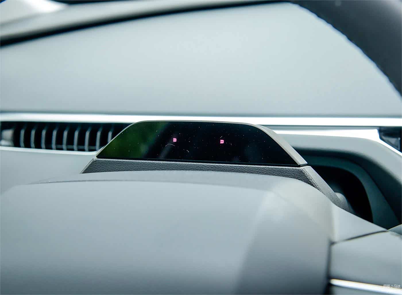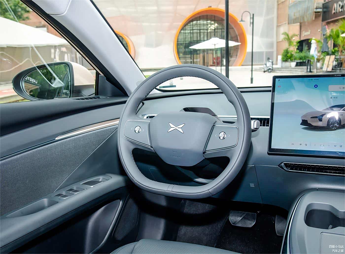 首先新车搭载了偏平底的方向盘,但不是很运动的那种,方向盘上非常简洁,中央一个小鹏车标,两侧各一个类似滚轮的功能设置键,除此之前没有其他按键和装饰,和特斯拉有些相似。新车也没有配备传统仪表盘设计。