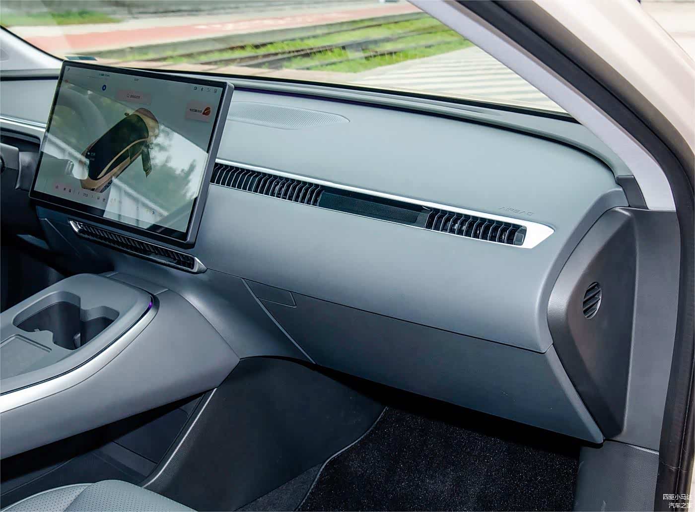 新车的中控部分没有其他物理按键,空调出风口的设计很显眼,中控台前方是一体式设计,整体性很好,在中间开了一条窄边缝隙作为空调出风口,这部分的设计争议还是很大的。