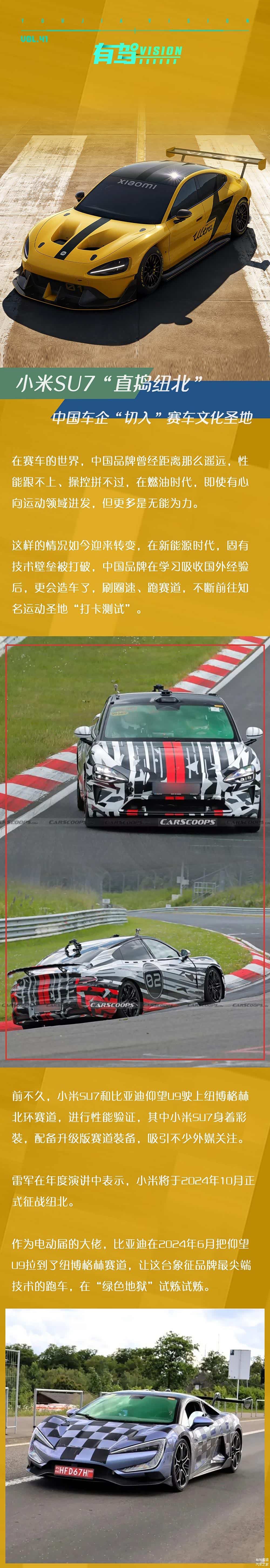 前不久, 小米SU7(图片 | 参数 | 询价)和比亚迪仰望U9驶上纽博格林北环赛道,进行性能验证,其中小米SU7身着彩装,配备升级版赛道装备,吸引不少外媒关注。