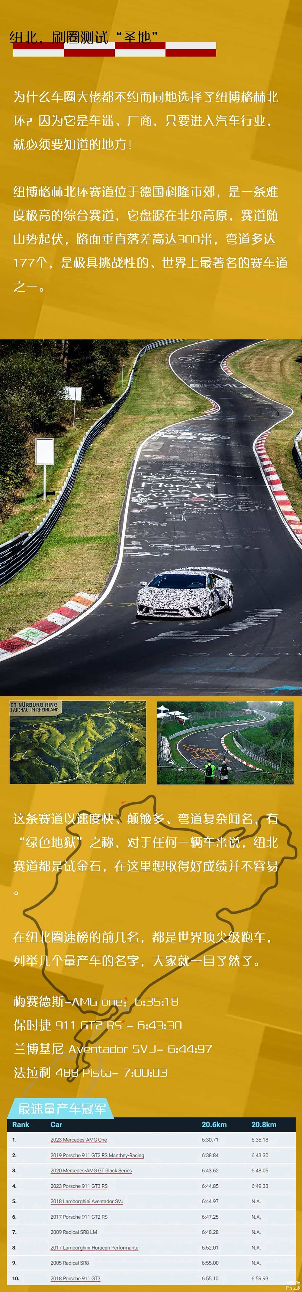 在纽北圈速榜的前几名,都是世界顶尖级跑车,列举几个量产车的名字,大家就一目了然了。梅赛德斯-AMG one:6:35:18、保时捷 911 GT2 RS - 6:43:30、兰博基尼 Aventador SVJ- 6:44:97、法拉利 488 Pista- 7:00:03。