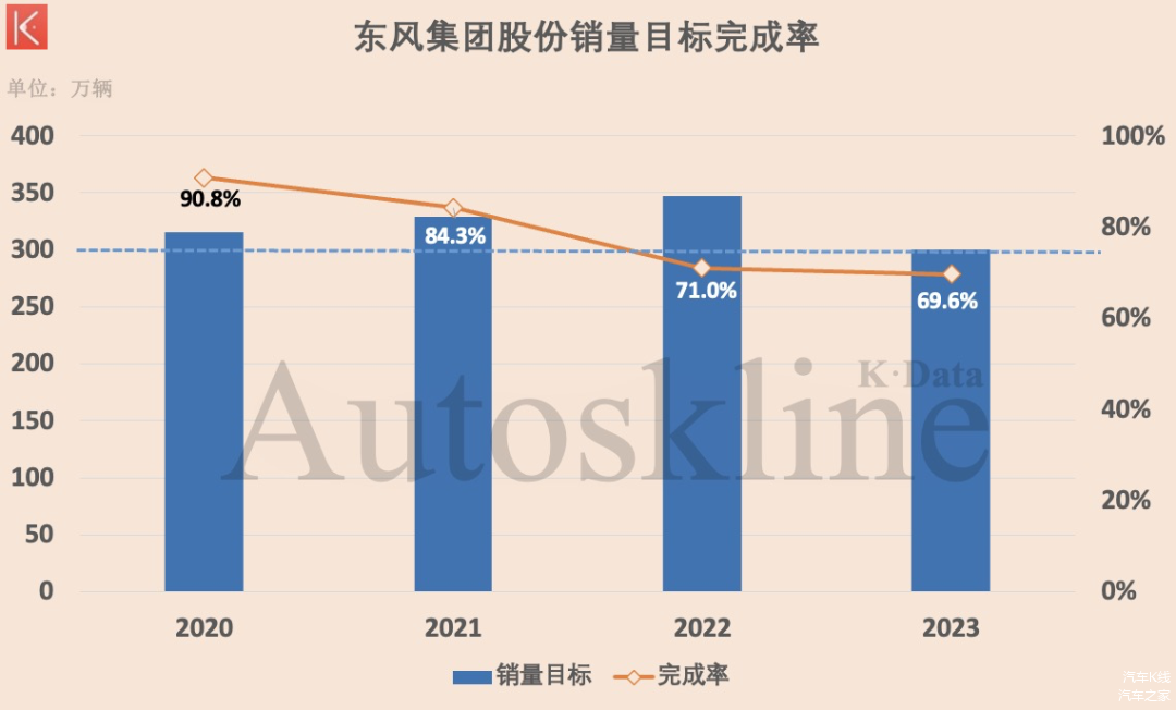 90.8%、84.3%、71.0%、69.6%,是东风集团股份2020年到2023年的目标完成率。逐年递减的销量和完成率,像一盆盆冷水,毫不留情地浇醒了这家有着光荣历史的老牌汽车央企。从鄂西北的十堰东迁湖北省会武汉,东风汽车正面临又一次危急时刻。