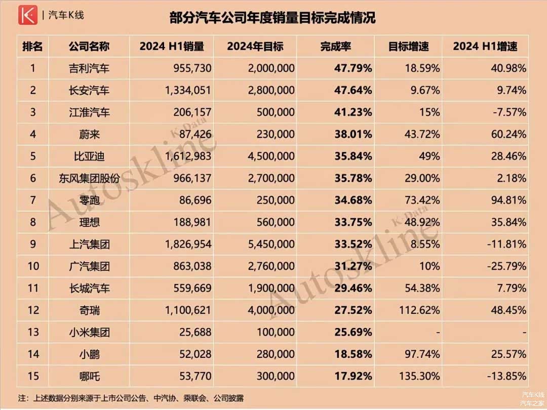 东风集团股份1~6月累计销售汽车96.6万辆,仅完成年度销量目标的35.78%。横向来看,这一完成率处于中游水平,虽不及吉利、长安和江淮,但高于上汽、广汽和长城。