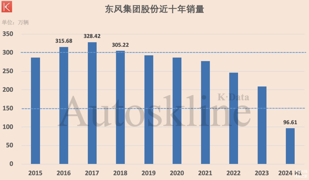 而这,不及东风汽车集团股份10年前的销量水平(2015年:286.7万辆)。