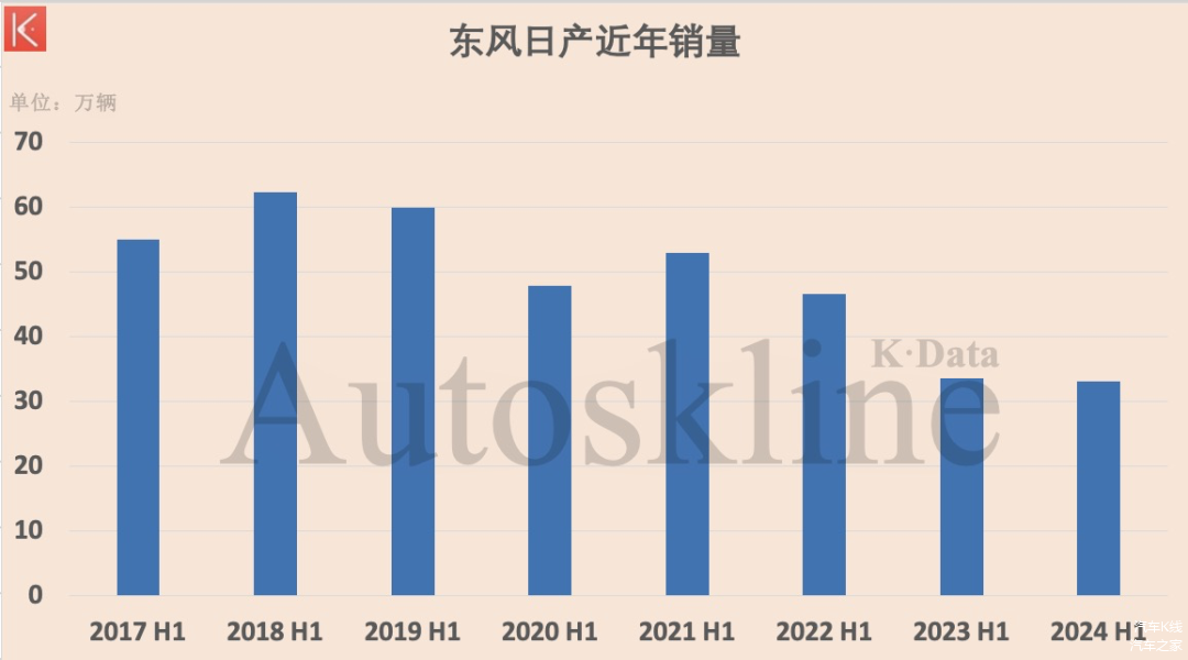 2018年上半年,东风日产(含启辰和英菲尼迪)销量为62万辆,如今仅有33万辆;对比月均销量也许更有冲击力,5年时间,其月均销量从10万辆,骤降至5万辆,达到“腰斩”水平。