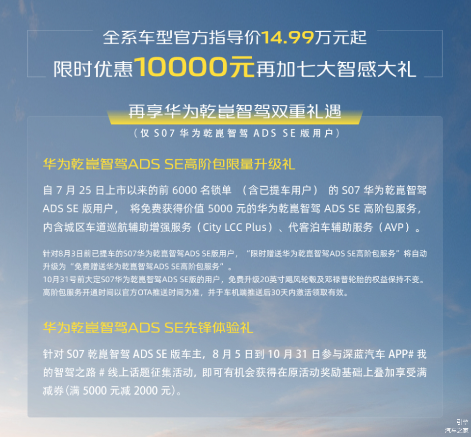 自7月25日上市以来的前6000名锁单(含已提车客户)的S07华为乾崑智驾ADS SE版用户,将获得价值5000元的华为乾崑智驾ADS SE高阶包终身永久免费订阅服务,内含城区车道巡航辅助增强订阅服务(City LCC Plus)、代客泊车订阅服务(AVP)。