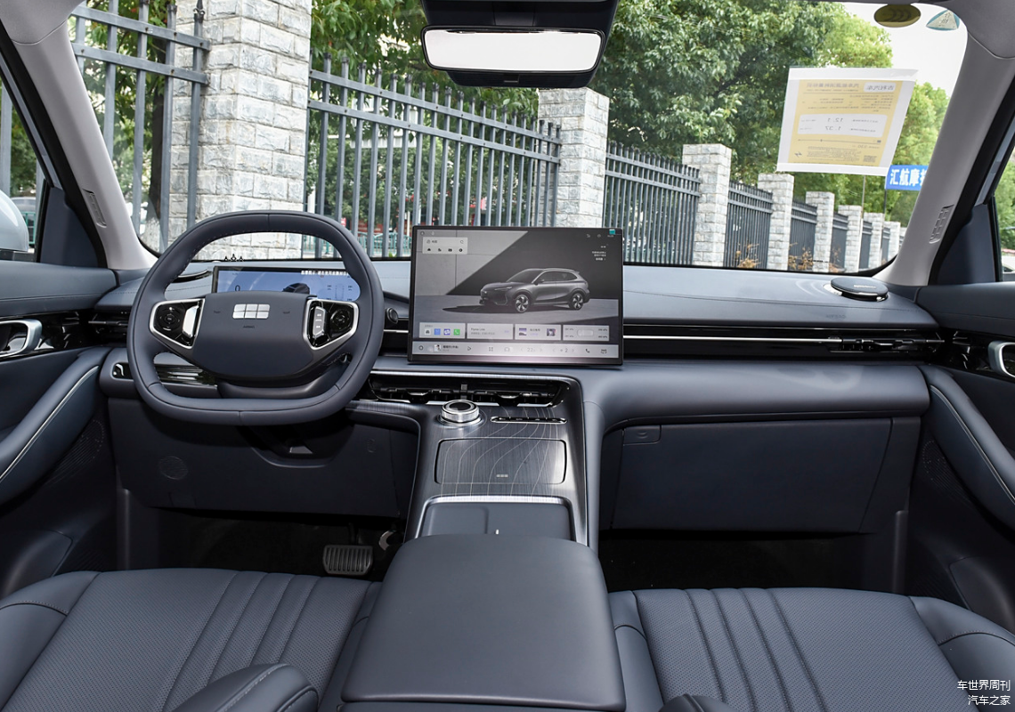 进入车内,吉利银河E5的整体风格也比较符合时下主流设计,通过不同材质的运动,营造出不错的品质感和氛围感。中控区域匹配有双幅式多功能方向盘、10.2英寸悬浮式全液晶仪表盘、15.4英寸悬浮式中控屏以及电子怀挡,科技感还是可以的。