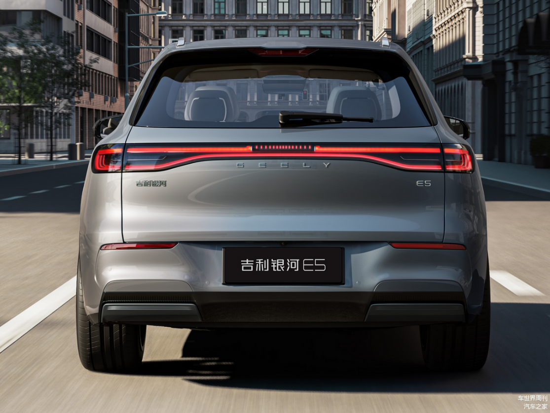 吉利银河E5整个尾部比较饱满立体,采用了常见的贯穿式尾灯设计,车顶还配备了大尺寸扰流板以及高位刹车灯。此外,新车底部还配备有黑色保险杠以及银灰色防擦板,进一步凸显了不错的运动气息。