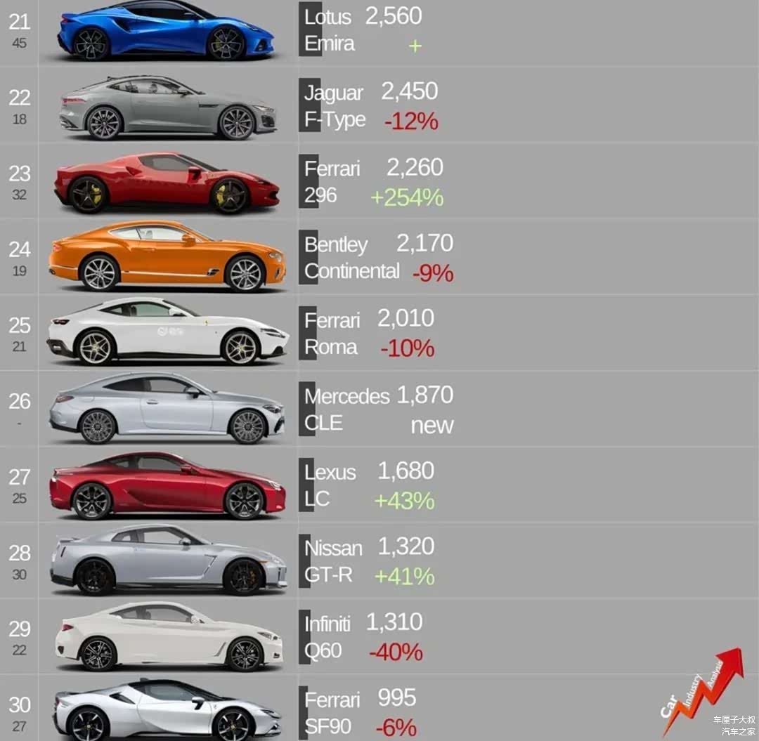 而备受大家期待的日产GT-R仅排在了28位,相信这是不少人的“梦中情车“,一直以其卓越的动力性能、精准的操控性和独特的外观设计,吸引了众多跑车爱好者的关注;但由于较高的价格和保养成本,让人望而却步。