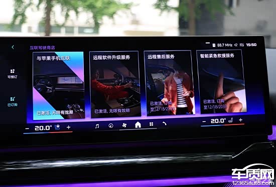 车机系统并未内置传统的应用商店,而是只有一个互联驾驶商店。点开后,内部分为“可预定”和“已订购”两组内容,评测车激活了“与苹果手机互联”、“远程软件升级服务”以及“智能紧急救援服务”等。具体来看,有些为无限有效期激活,另外还有一部分订购内容只在有效期内才会生效。