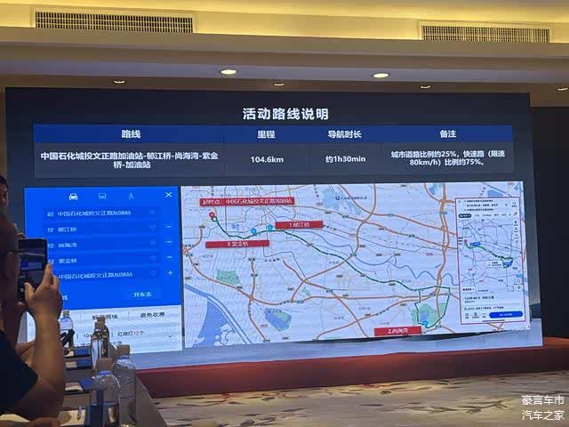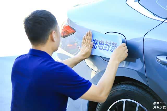 我们这辆车是海豹06的最低配版本,也是随机抽选的,天窗都没有。入门款的车型容量是最小的80km,并且是亏电状态13%电。排好队先去加油站加满油,加油口/充电口贴好封条,满油状态25%市区+75%快速路,限速为80km/h,全程大概105公里。