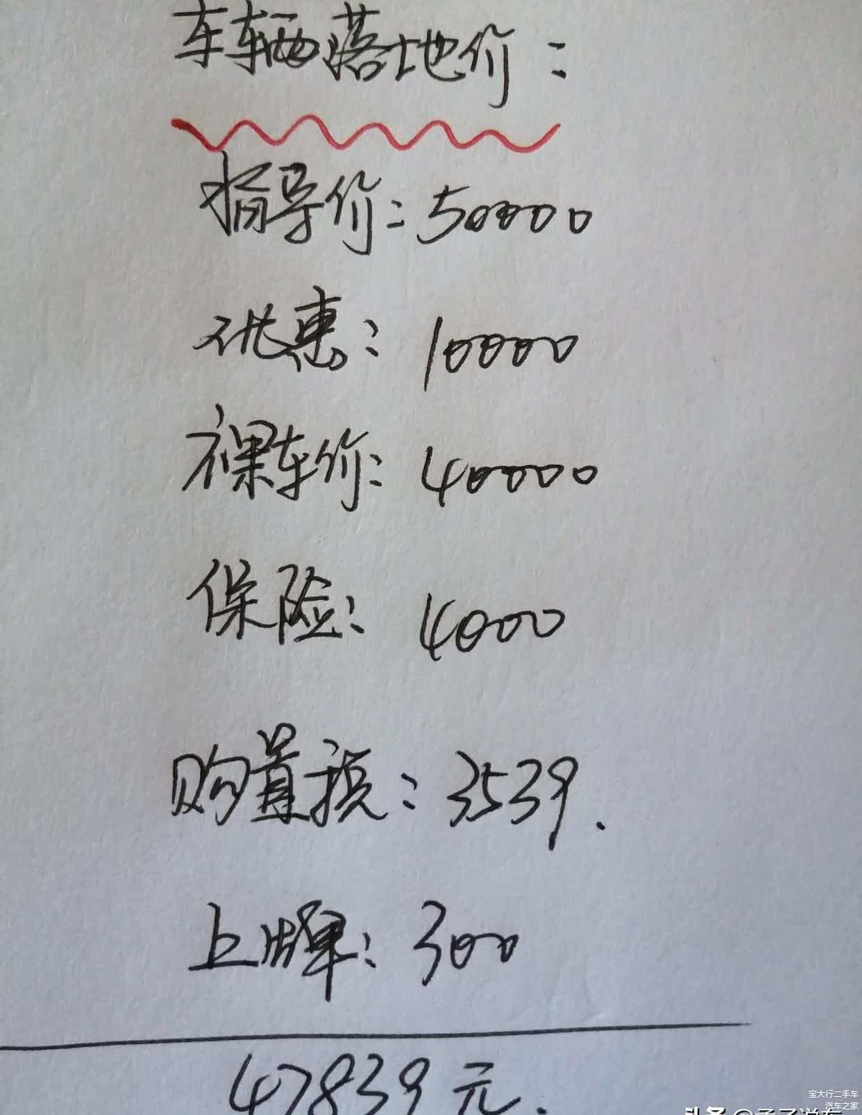 其次,再来聊聊车辆的落地价,车辆的落地价格其实就是我们全款买车的价格,从上图大家能够看到,车子的指导价5万元,优惠价格1万元,裸车价4万元,车辆的保险4000元,车辆的购置税3539元,车辆的上牌费300元,全款落地的费用在47839元,这就是一辆车子的落地价,而当我们全款购买车子的时候,总费用也就是由这4部分所构成的,当你买车时若有其它的费用出现,可以和销售谈一谈。