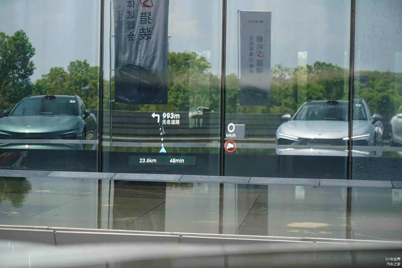 AR-HUD的显示范围确实够大也够清晰,AR模式下可以在道路上显示虚拟的箭头动画,也可以使用普通模式直接将导航地图显示在上面。
