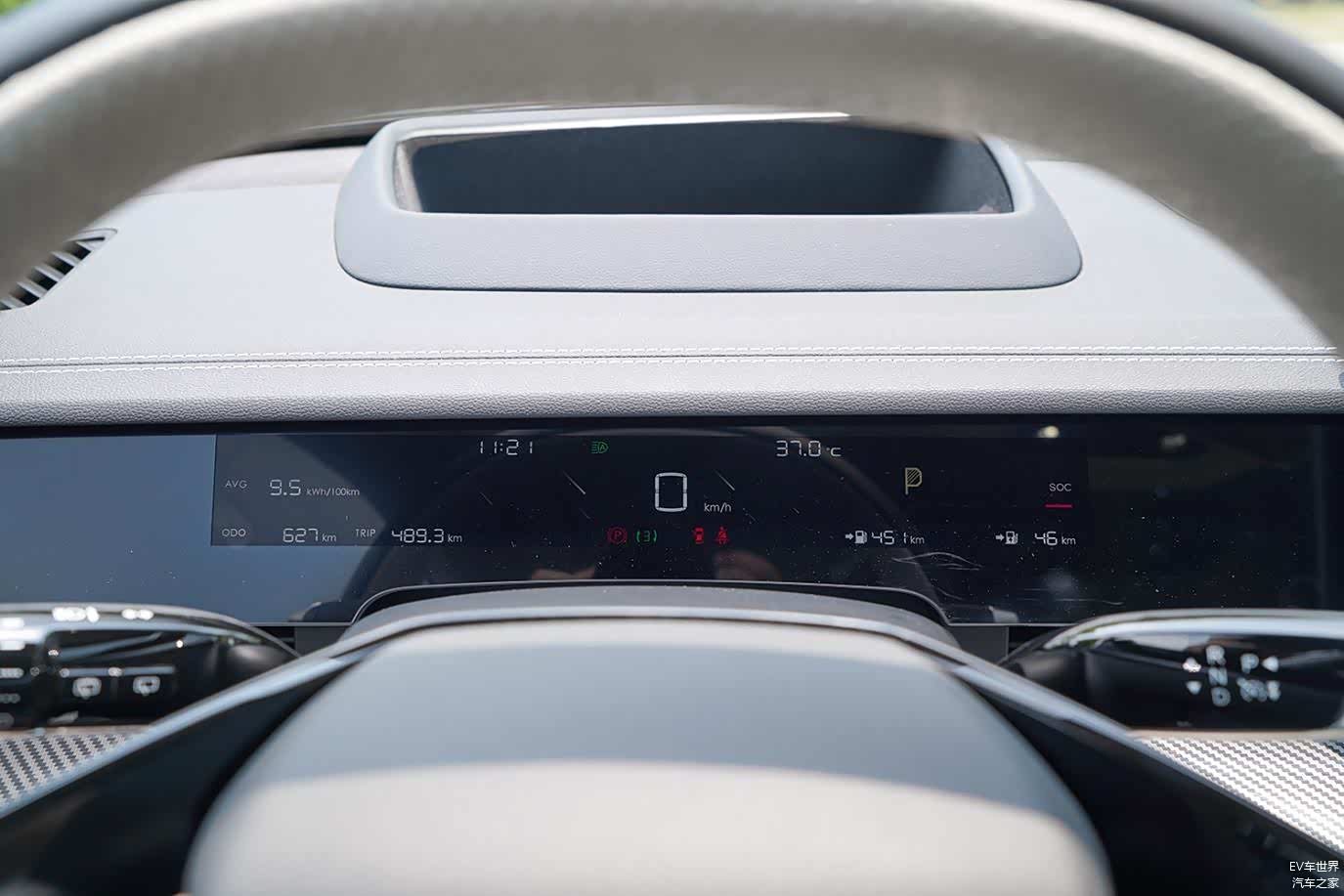 我们试驾的增程版本使用1.5L四缸增程器,WLTC工况下的馈电油耗为5.7L/100km,配合43.88度的三元锂电池,其纯电续航为300km,整车的满油满电综合续航可以达到1200km。