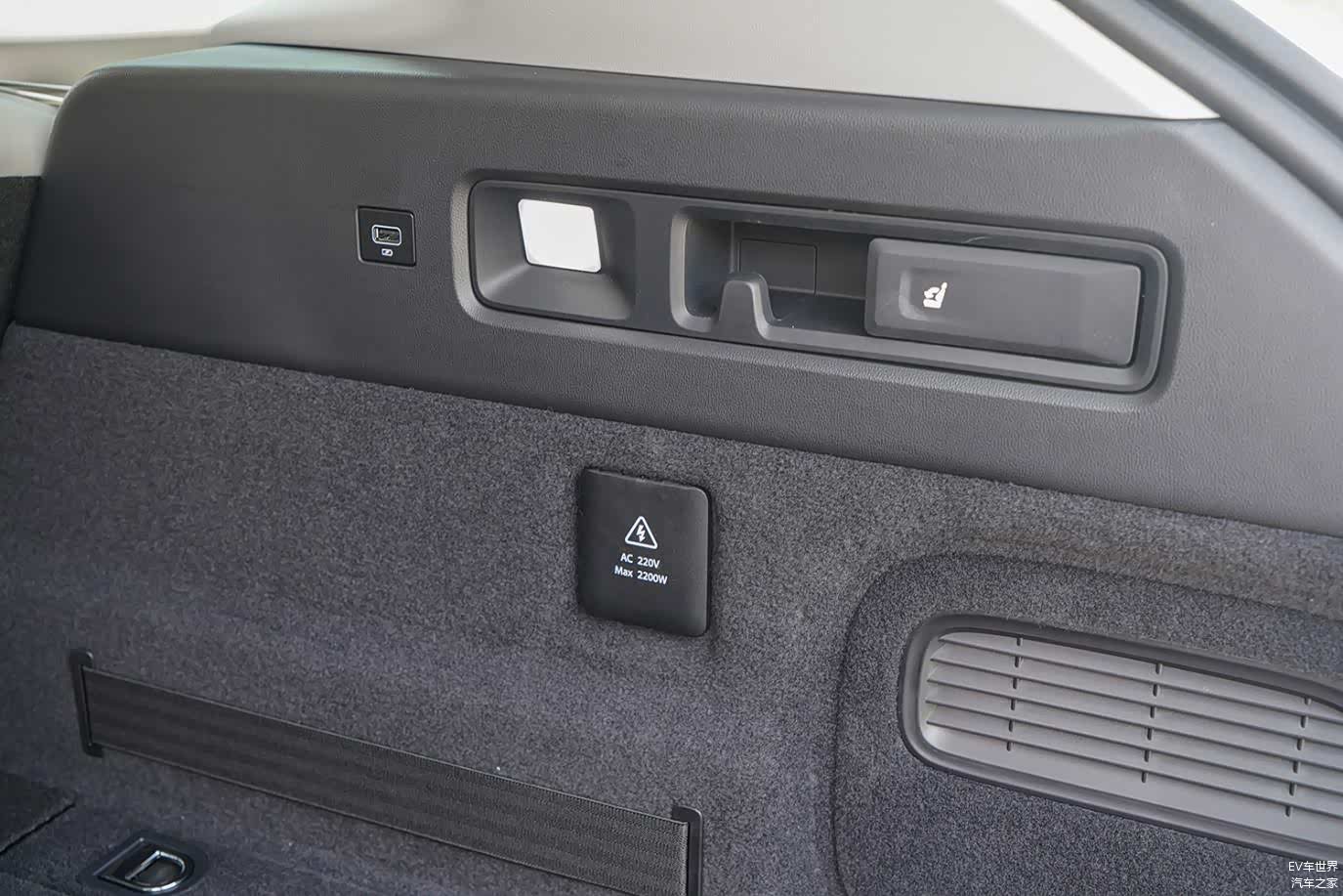 座椅可以使用后备厢内的把手进行放倒,并且还带有USB借口和220V的标准插座,最大输出功率为2.2kW,去野外露营带动单个电子炉之类的刚好够用。另外整个后备厢盖板下层还有额外的储物空间可以拓展。