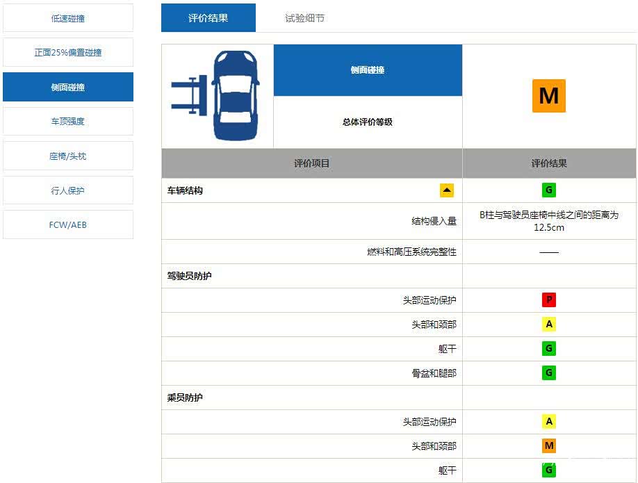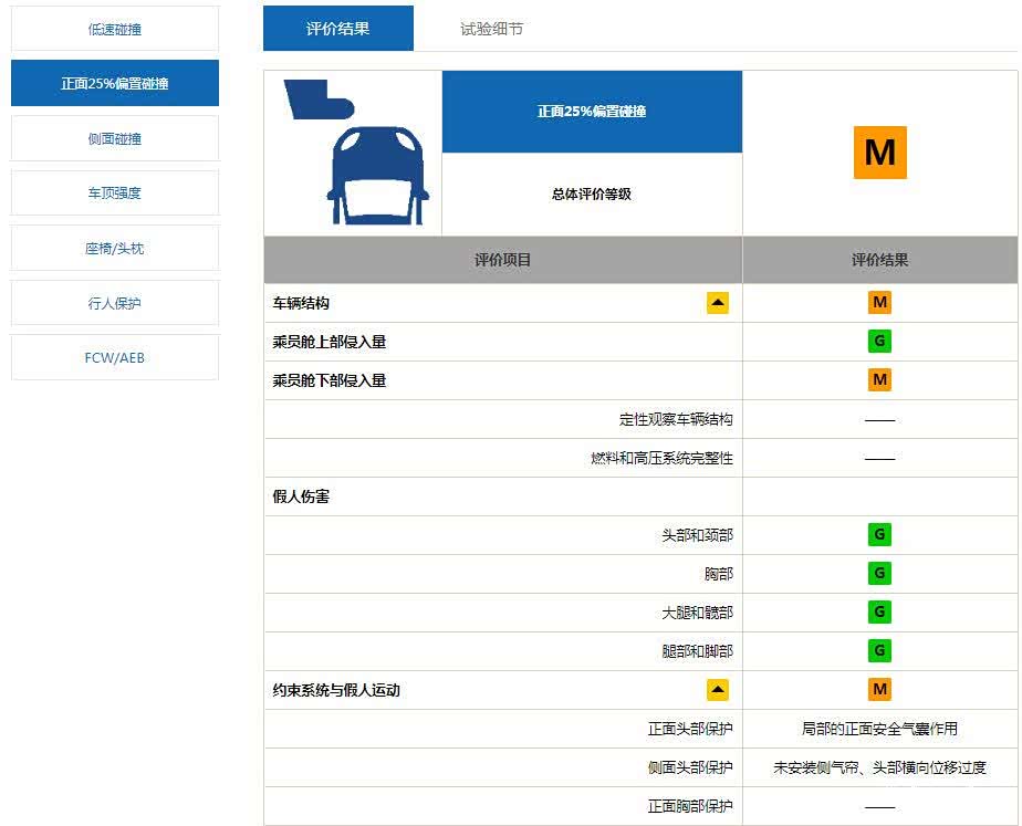 凌派在正面25%偏置碰撞中也只是获得了M一般的成绩,其车辆结构、乘员舱下部侵入量以及约束系统与假人运动的项目中均获得了一般的成绩,在约束系统与假人运动的项目中之所以成绩不佳,主要原因是因为未安装侧气帘、头部横向位移过度。