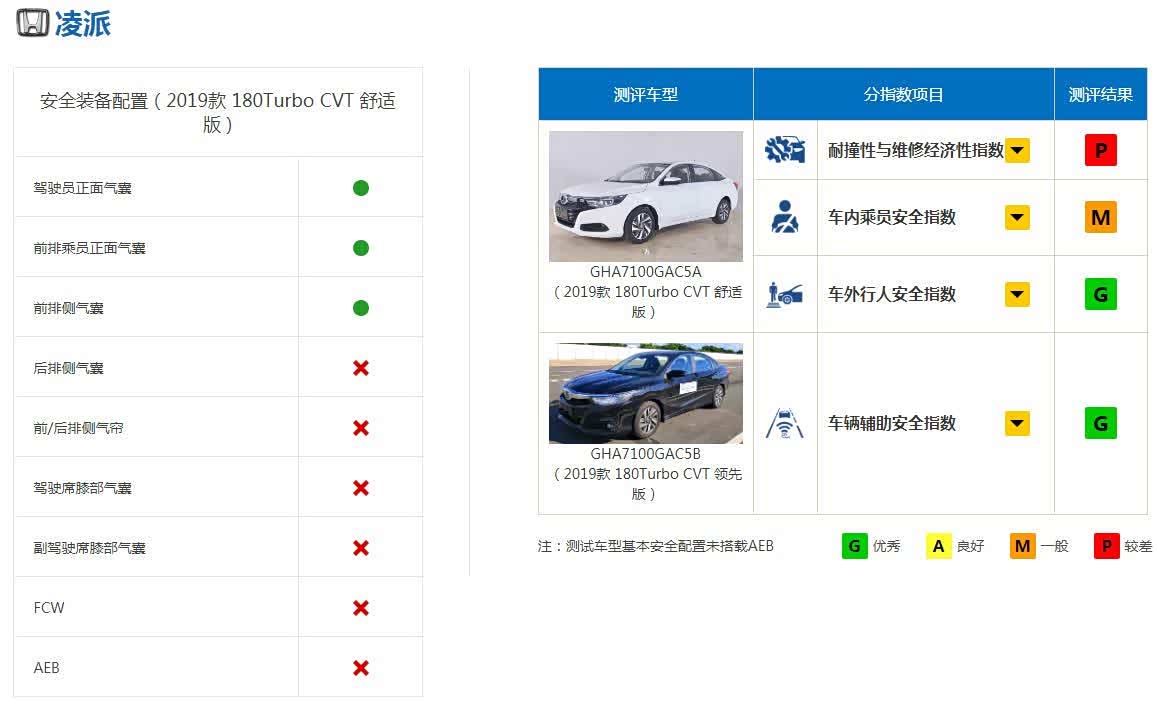 而凌派在中保研的碰撞测试中,获得了车外行人安全指数和车辆辅助安全指数两大项目的G优秀成绩,车内乘员安全指数只获得了M一般的成绩,耐撞性与维修经济指数则是P较差的成绩。