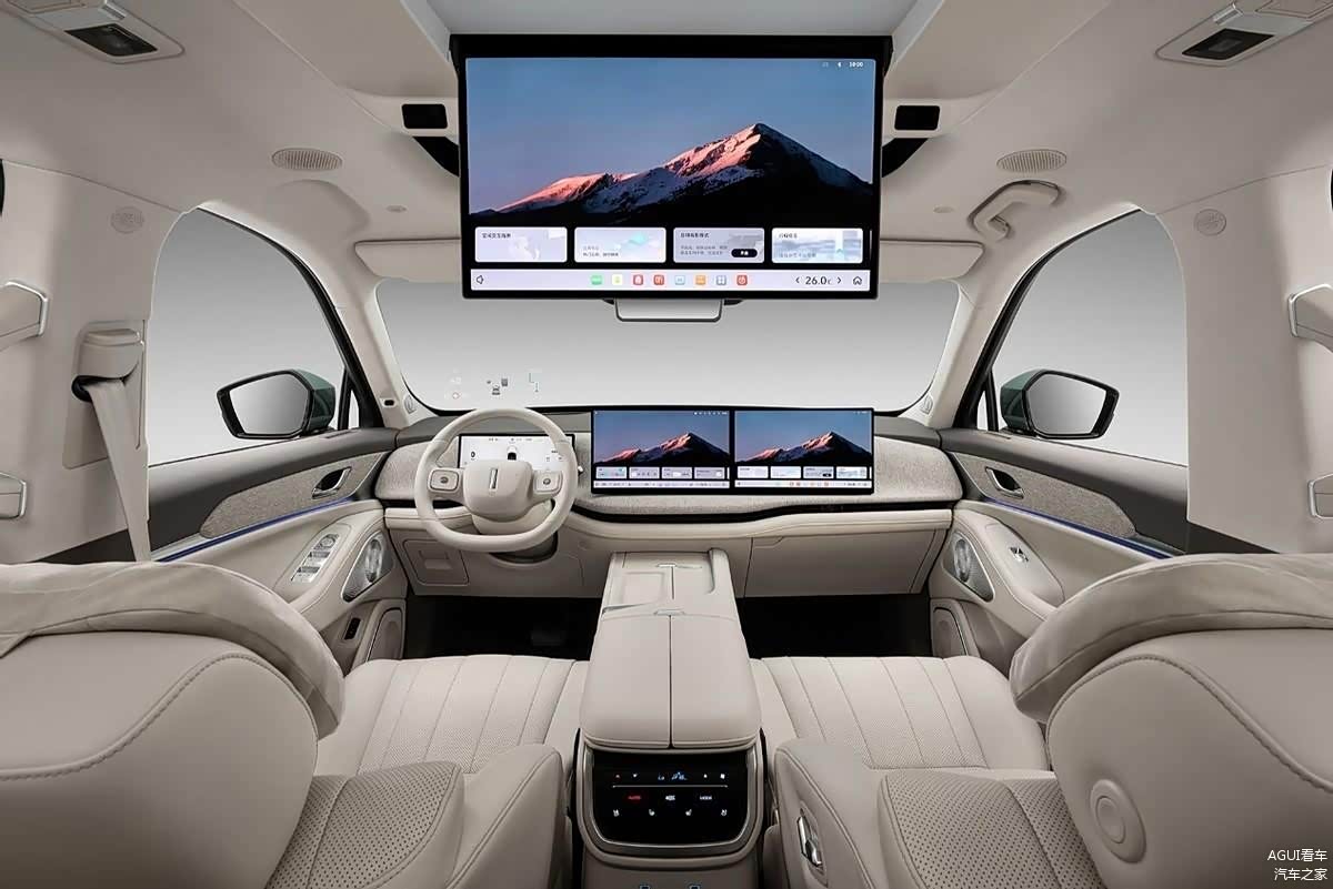 内饰方面,蓝山智驾版的中控布局有所变化,采用了1块液晶显示屏和两块15.6英寸的大尺寸中控屏,中控台材料改为了类似科技布的织物面料。此外,该车型还为第二排乘客提供了17.3英寸的娱乐屏。