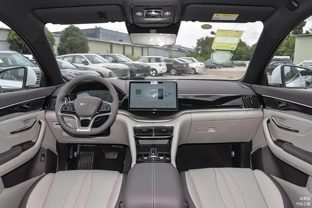 内饰方面,2025款比亚迪宋PLUS EV的内饰设计布局也没有太大变化,车内依旧是配备了全液晶仪表盘、悬浮式的中控屏和平底的三幅式多功能方向盘,电子档杆的造型也比较精致,科技感还是做得比较到位的。内饰的用料也比较扎实,使用了大面积的软质材料进行包裹,搭配上一些镀铬饰条和缝线工艺进行装饰,提升了内饰的档次感。