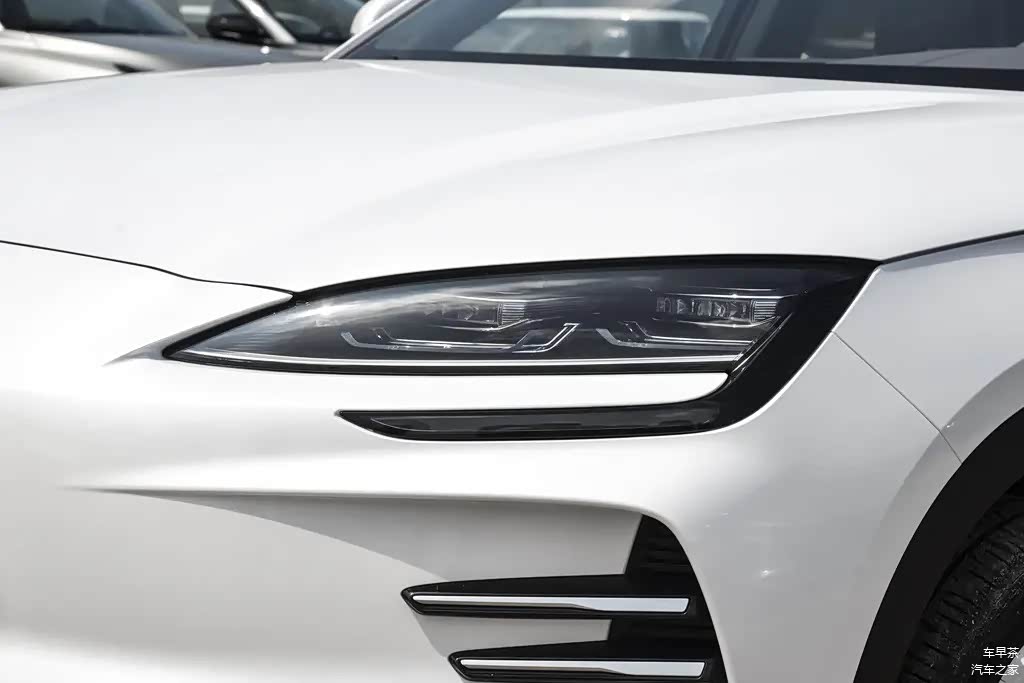 从外观上来看,2025款比亚迪宋PLUS EV是沿用了旧款车型的设计造型,它的前脸是配备了封闭式的进气格栅,大灯也采用了家族最新的设计造型,看起来十分犀利。它的下包围是采用了三段式的造型,两侧的导流槽内部是加入两条灯带进行装饰,中间的进气口则是加入了镀铬饰条进行装饰,整个前脸的辨识度还是非常高的。