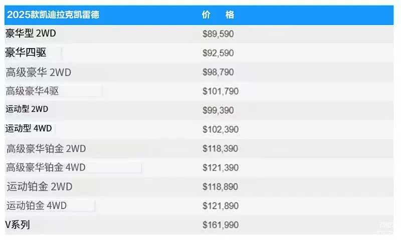 以下是2025款凯雷德的详细价格表,包括不同饰板定价以及后轮驱动与四轮驱动之间的差异。值得注意的是,除了凯雷德V车型外,所有车型均提供3000美元的选择作为标准配置。