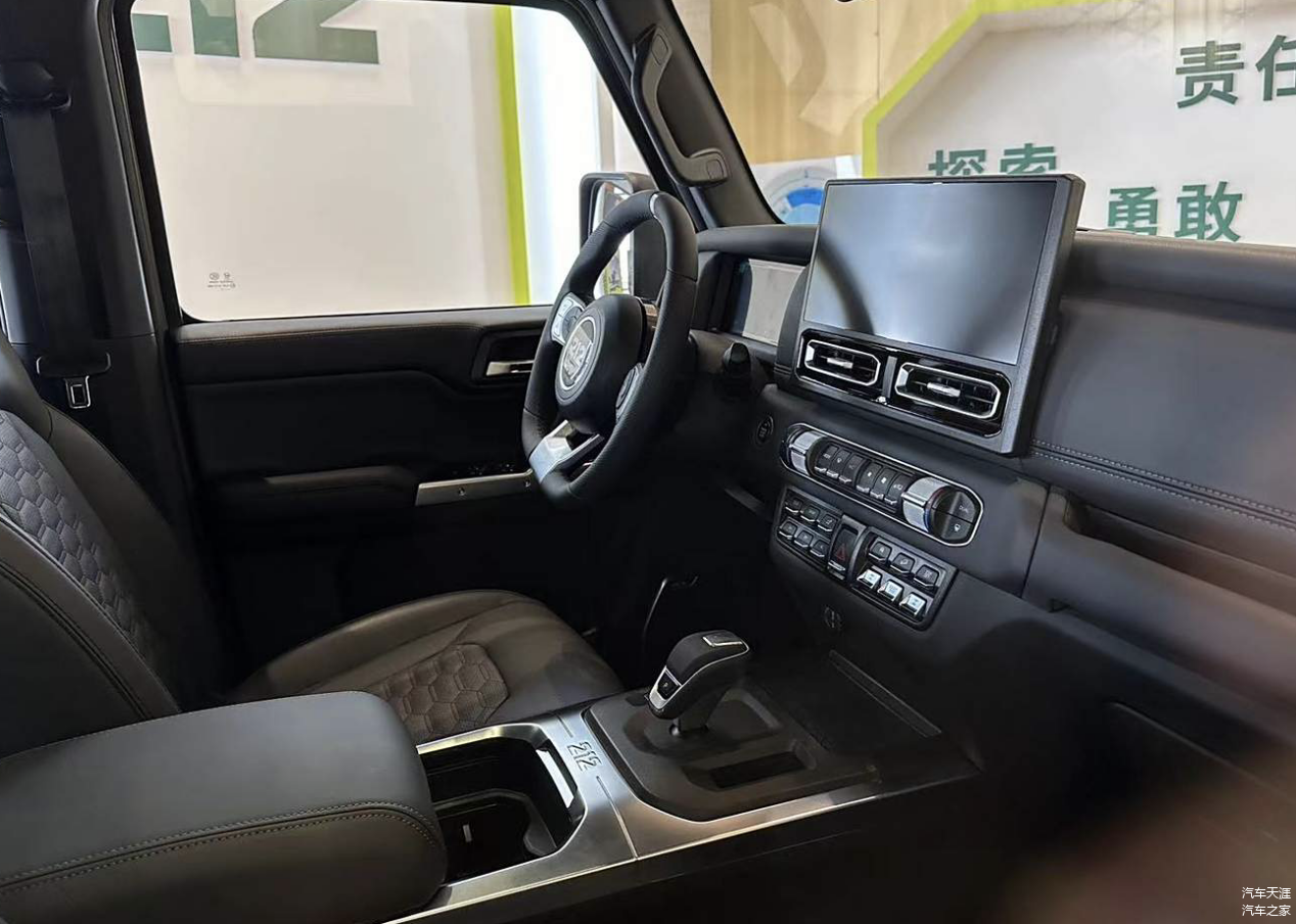 其次是智能化升级非常明显,老款的212狙击手内饰非常简陋,塑料感很强,全新的212换上了大尺寸的悬浮式中控屏和液晶仪表,挡把和副驾驶横向握把样式也做了调整,智能化水平明显提升,并且保留了大多数物理按键,这对于喜欢硬派越野的玩家来说,是个不小的诱惑力。