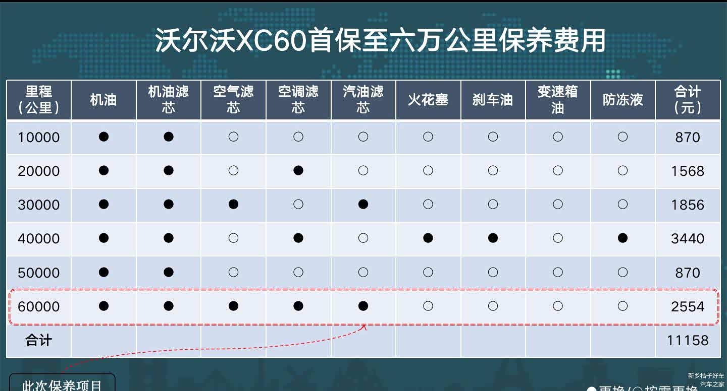 我们先对沃尔沃XC60各个阶段的保养项目及费用进行总结,按照规定,沃尔沃XC60保养周期为10000公里/次,新车行驶里程到达10000公里或者购车时间满半年进入首保期。常规小保养只需更换机油、机滤即可,空气滤芯和汽油滤芯都是每30000公里更换一次,空调滤芯是每20000公里更换一次,像火花塞、刹车油等配件使用时长相对久一些,每40000公里更换一次。根据计算得知,沃尔沃XC60首保至六万公里保养费用共计11158元,假设一年行驶两万公里的话,平均每年花在保养上面的费用约3719元。
