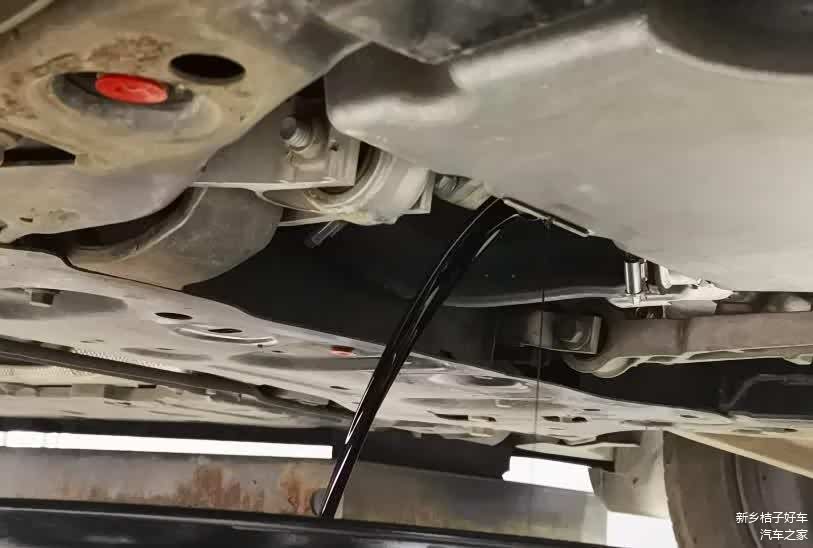 升起车辆后,维修技师会先检查车辆的底盘,查看发动机护板是否有破损、排气管是否有碎石击打的痕迹等,发现异常就得及时处理。卸掉护板后就能正常放机油了,从图片中可以看到这台车的机油已经发黑,品质显然达不到使用要求了。