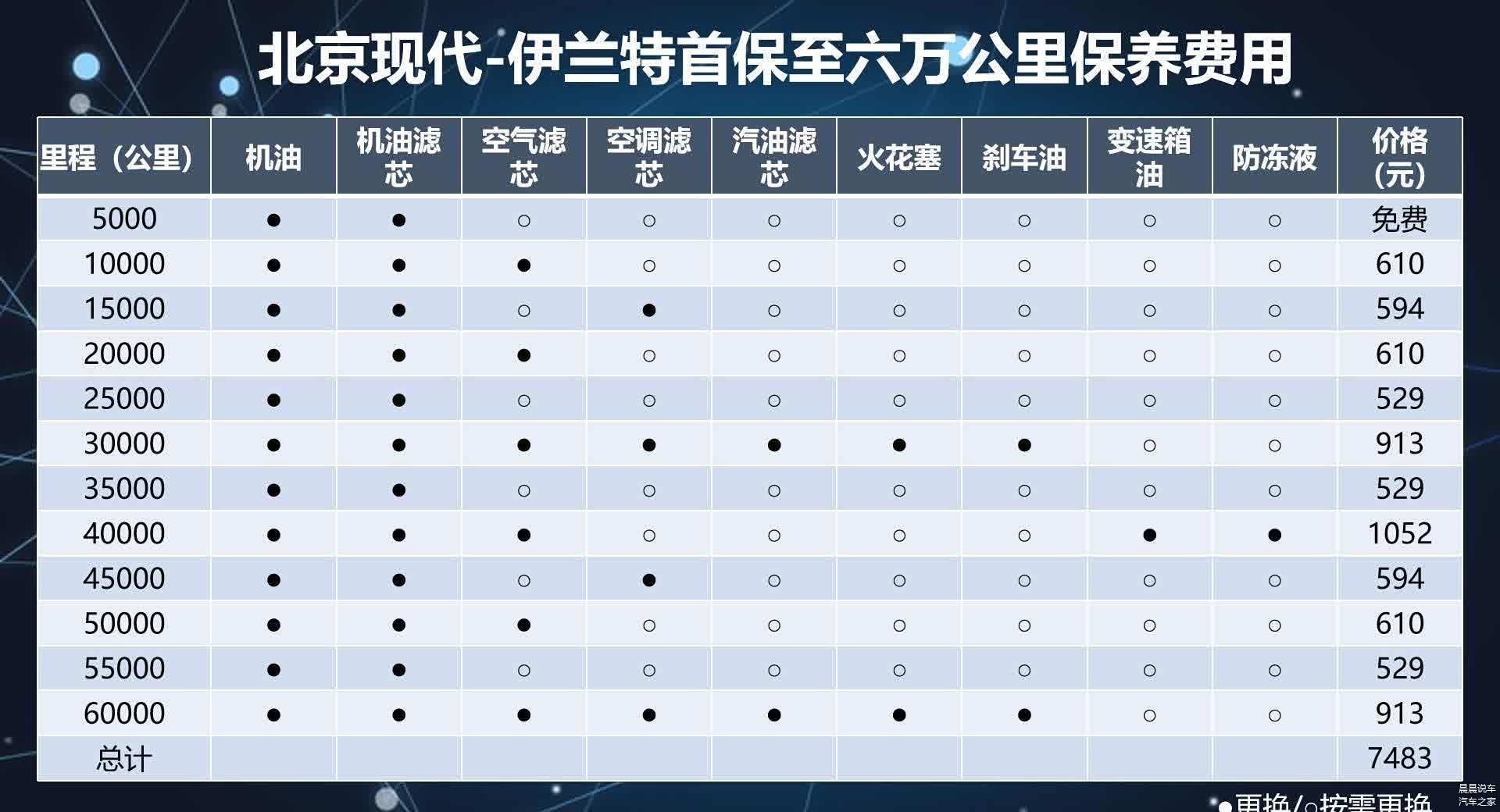 根据保养手册上面的规定,伊兰特每隔5000公里就需要进行保养。相对来说,它的保养周期较短,免不了要经常往4S店跑。基础保养仅需更换机油、机滤即可,伊兰特的空气滤芯建议每隔10000公里更换,空调滤芯可以使用久一点,每20000公里更换一次就行。通过计算,伊兰特首保至六万公里累计保养费用7483元,其中包含了配件费用和工时费。如果按照每年行驶两万公里计算,那么伊兰特平均每年的保养支出约为2494元。总体来看,还是比较经济实惠的,对普通上班族来说也没有太大的压力。