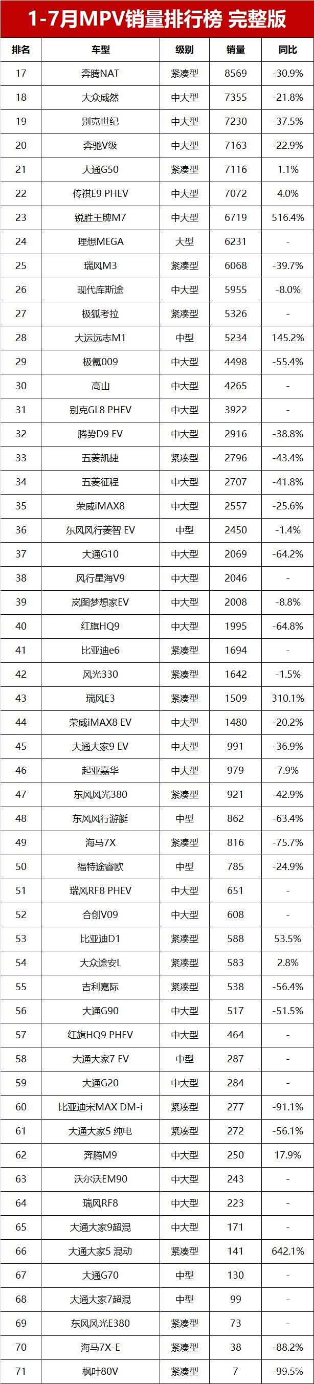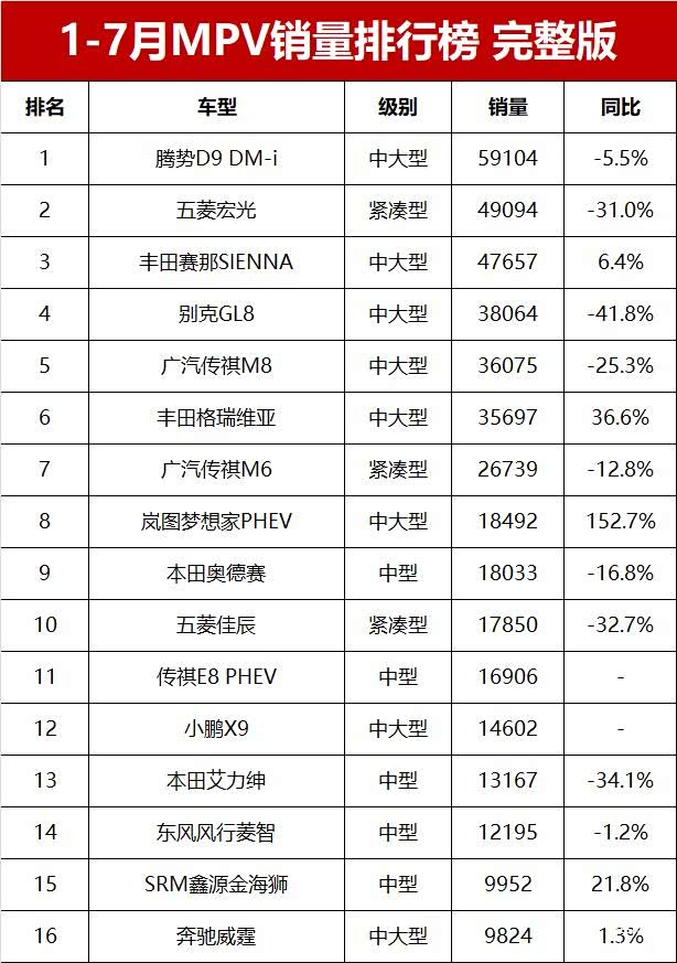 【2024年1-7月MPV销量排行榜 完整版】最近两年销售回暖的MPV市场,今年销量又出现下滑。乘联会数据显示,2024年1-7月国内MPV市场零售销量只有56.4万辆,同比减少8.4%。